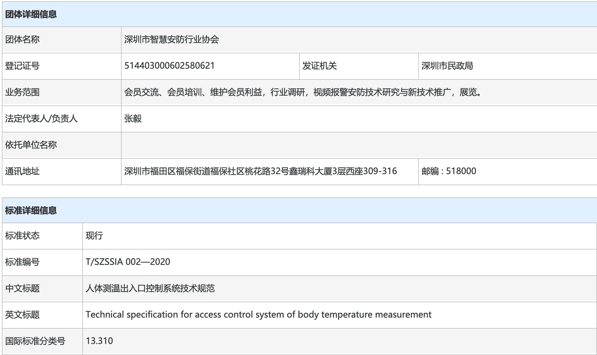 深圳市智慧安防行業協會發布的T/SZSSIA 002—2020《人體測溫出入口控...